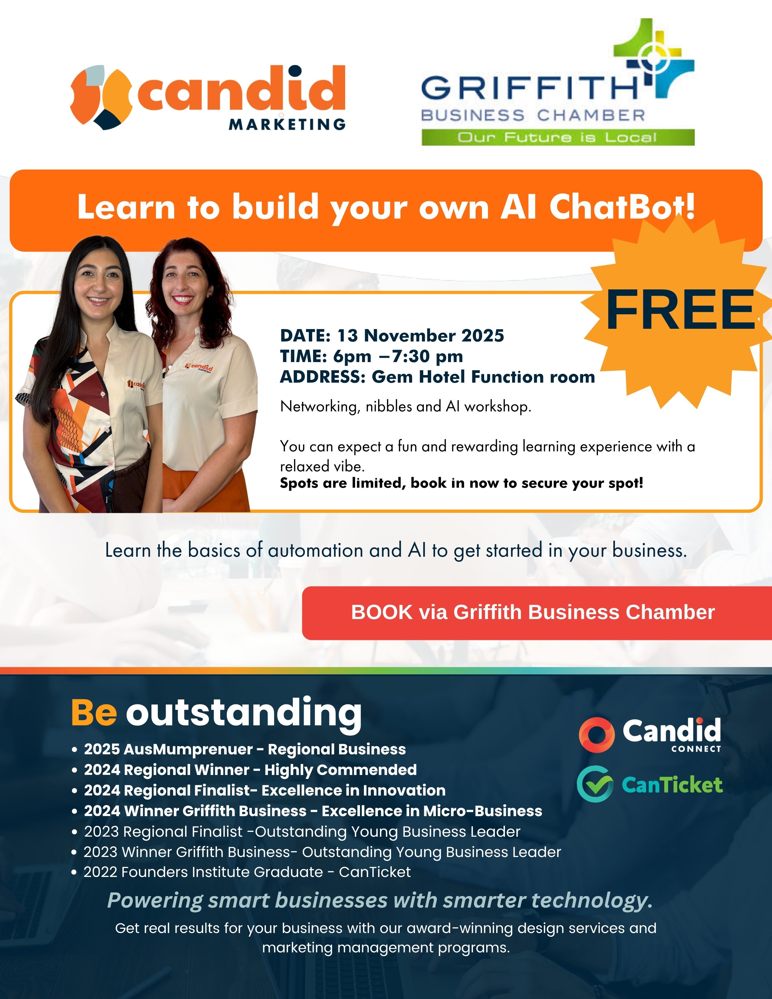 Join us for a FREE Griffith Business Chamber event, proudly hosted with Candid Marketing as your speaker! This hands-on workshop will guide you through how to design, build, and launch your very own AI ChatBot — no tech degree required!